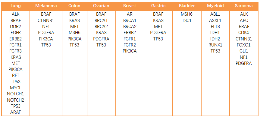 產(chǎn)品特性: 1. 樣本來(lái)源于臨床分離建立的細胞系,非常接近臨床病人的特性; 2. 泛癌種,涉及多種腫瘤相關(guān)的基因:肺癌、乳腺癌、結直腸癌、胰腺癌、血液腫瘤、胃癌等等,部分基因羅列如下: