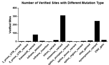 圖3. 不同突變頻率的位點(diǎn)數(經(jīng)過(guò)驗證的位點(diǎn)) 6. 突變類(lèi)型全覆蓋,有UTR區域,有內含子,有外顯子,有錯義突變,有同義突變,有供體變異等等;