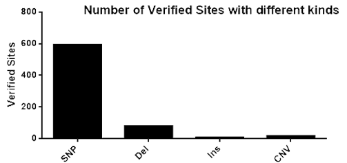 圖1. 在不同染色體編號上的位點(diǎn)數(經(jīng)過(guò)驗證的位點(diǎn)) 4. 變異種類(lèi)多:涉及SNP,deletion,insertion,CNV等等;
