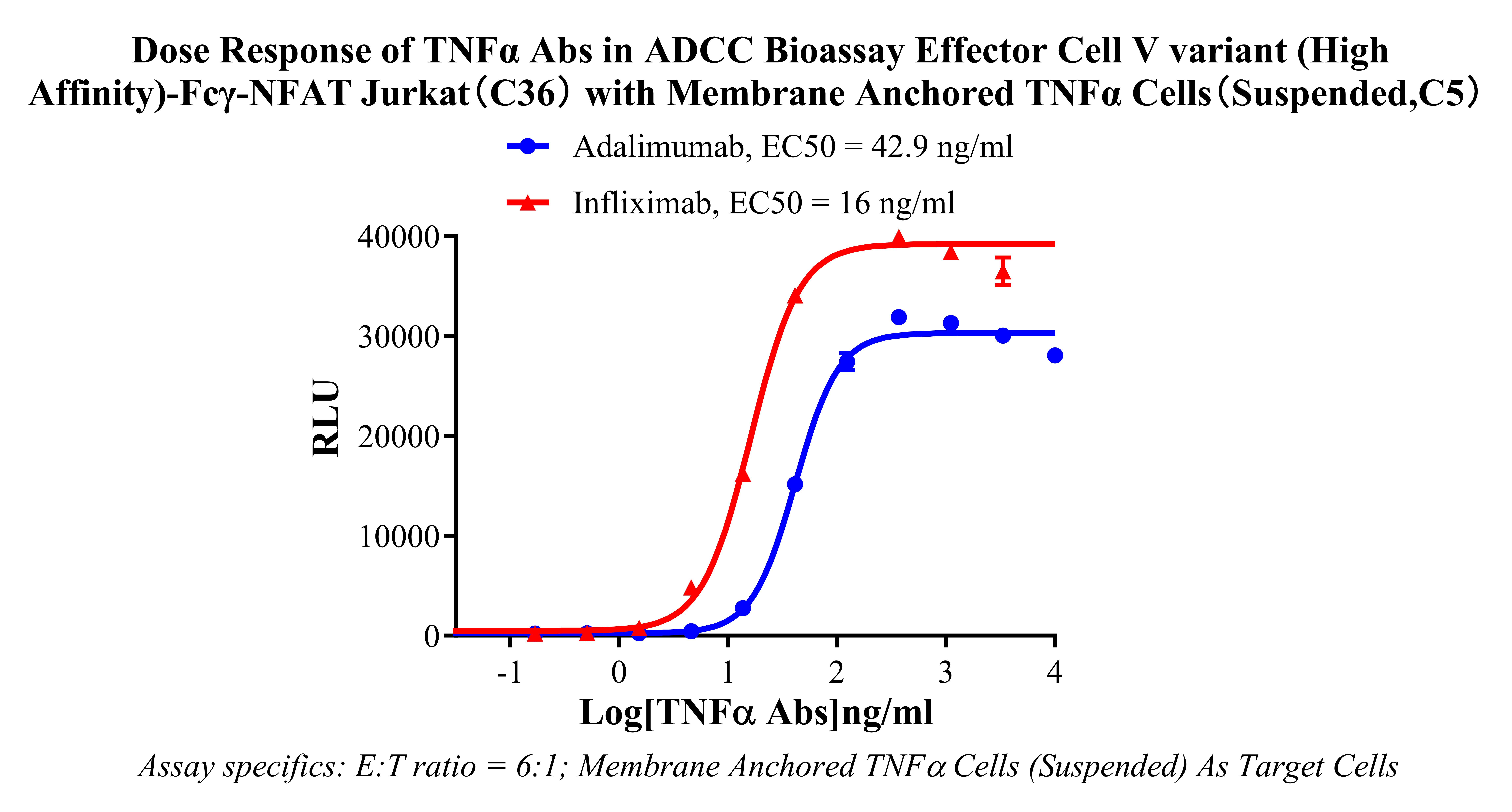 Figure 2. Dose response of TNFα Abs in ADCC Bioassay Effector Cell (High Affinity)-Fcγ-NFAT Jurkat (C36) With Membrane Anchored TNFα Cell (Suspended, C5).