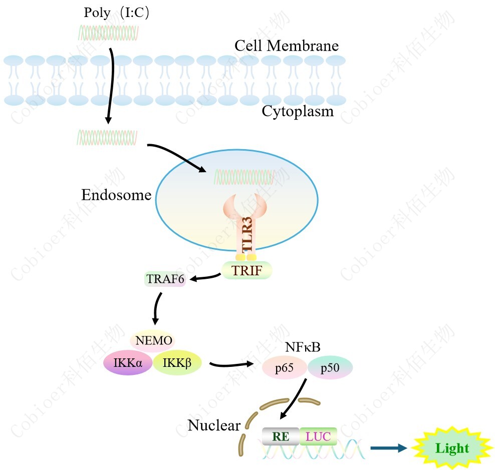 TLR3 NFκB-Luc HEK293 報告基因藥靶模型很好的模擬了體內 TLR3 的信號轉導過(guò)程, 原理見(jiàn)下圖所示。