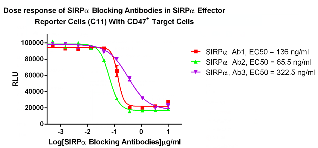 Figure 2. Dose response of SIRPɑ Blocking Antibodies in SIRPɑ Effector Reporter Cells With CD47+ Target Cells. |