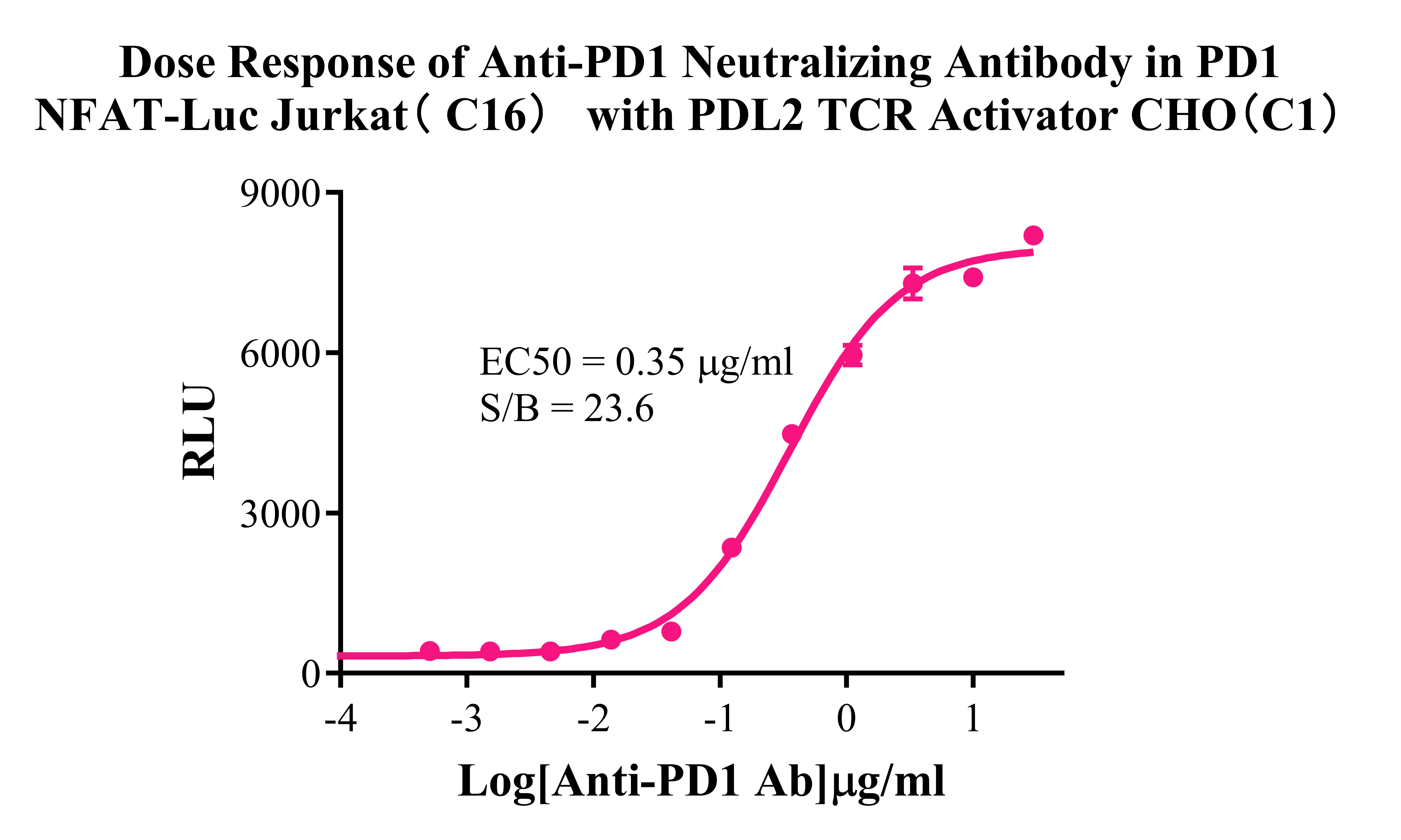 Figure 3. Dose Responese of anti-PD1 neutralizing antibody in PD1 NFAT-Luc Jurkat (C16) with PDL2 TCR Activator CHO(C1).