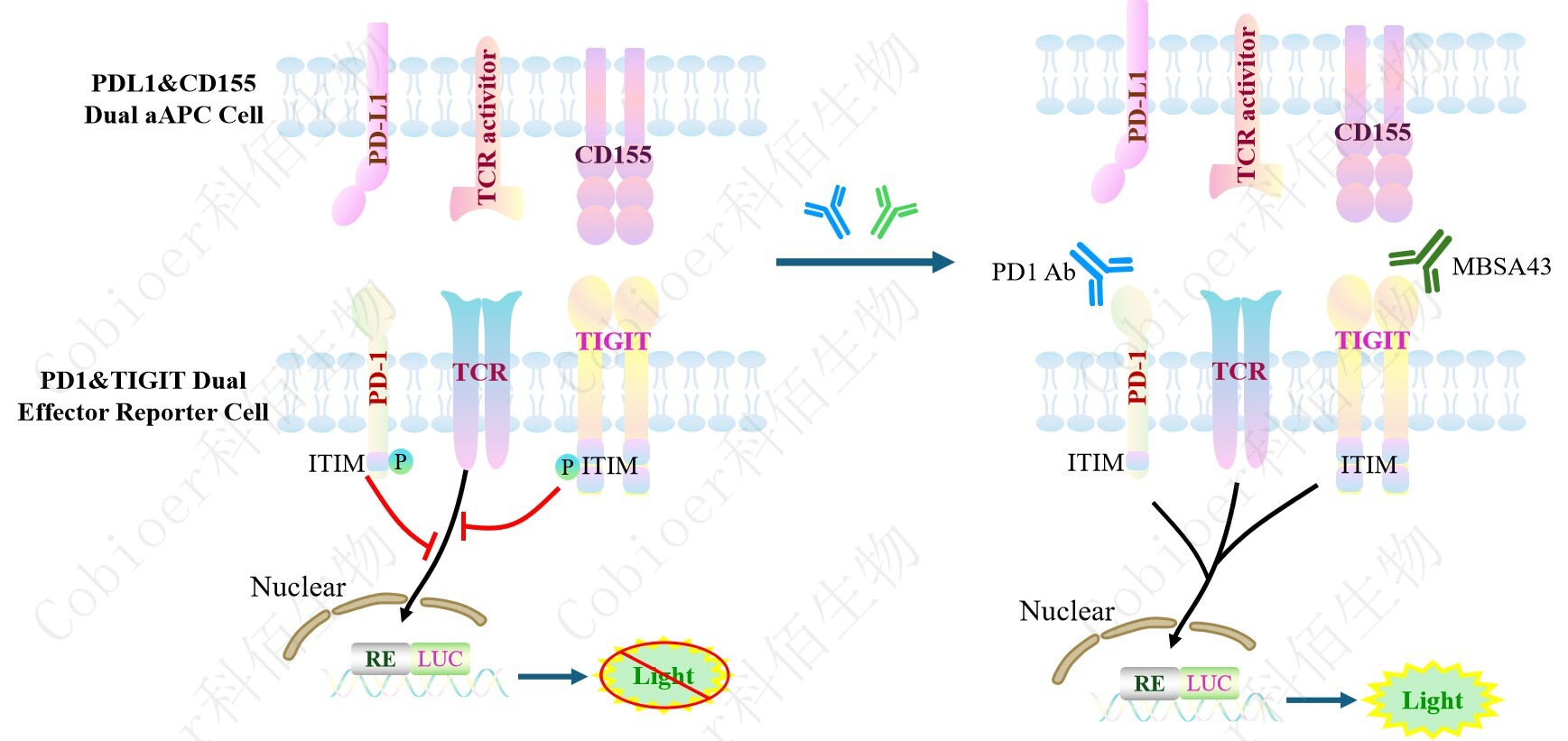 PD1&TIGIT Dual Effector Reporter Cell 報告基因藥靶模型很好的模擬了體內PD1&TIGIT 的信號轉導過(guò)程,原理見(jiàn)下圖所示。