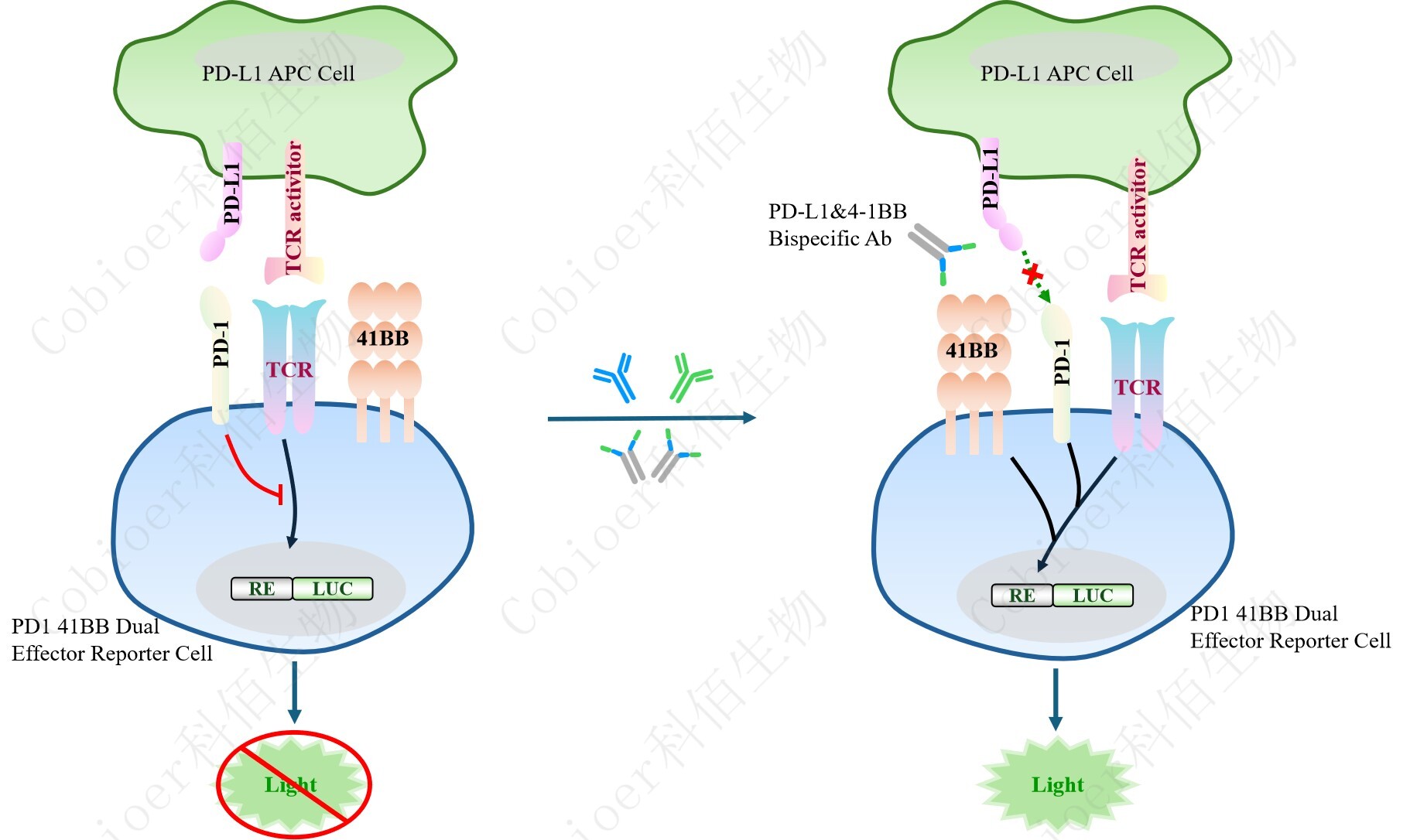 PD1 4-1BB Dual Effector Reporter Cell 報告基因藥靶模型很好的模擬了體內 PD1&4- 1BB 的信號轉導過(guò)程,原理見(jiàn)下圖所示。