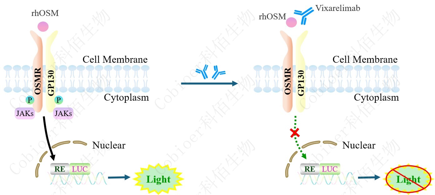 OSMR Effector Reporter Cell 報告基因藥靶模型很好的模擬了體內 OSMR 的信號轉導過(guò)程,原理見(jiàn)圖所示。