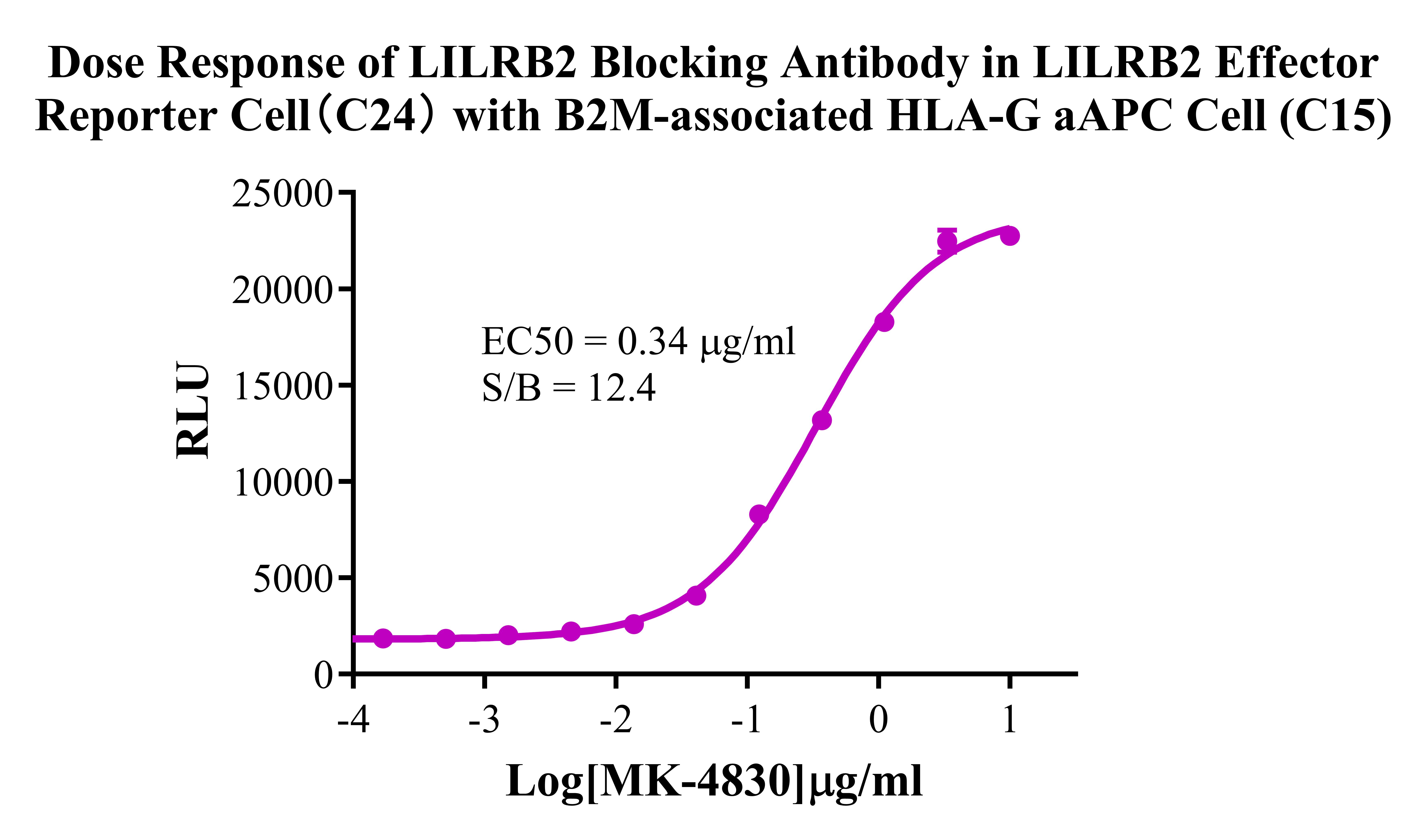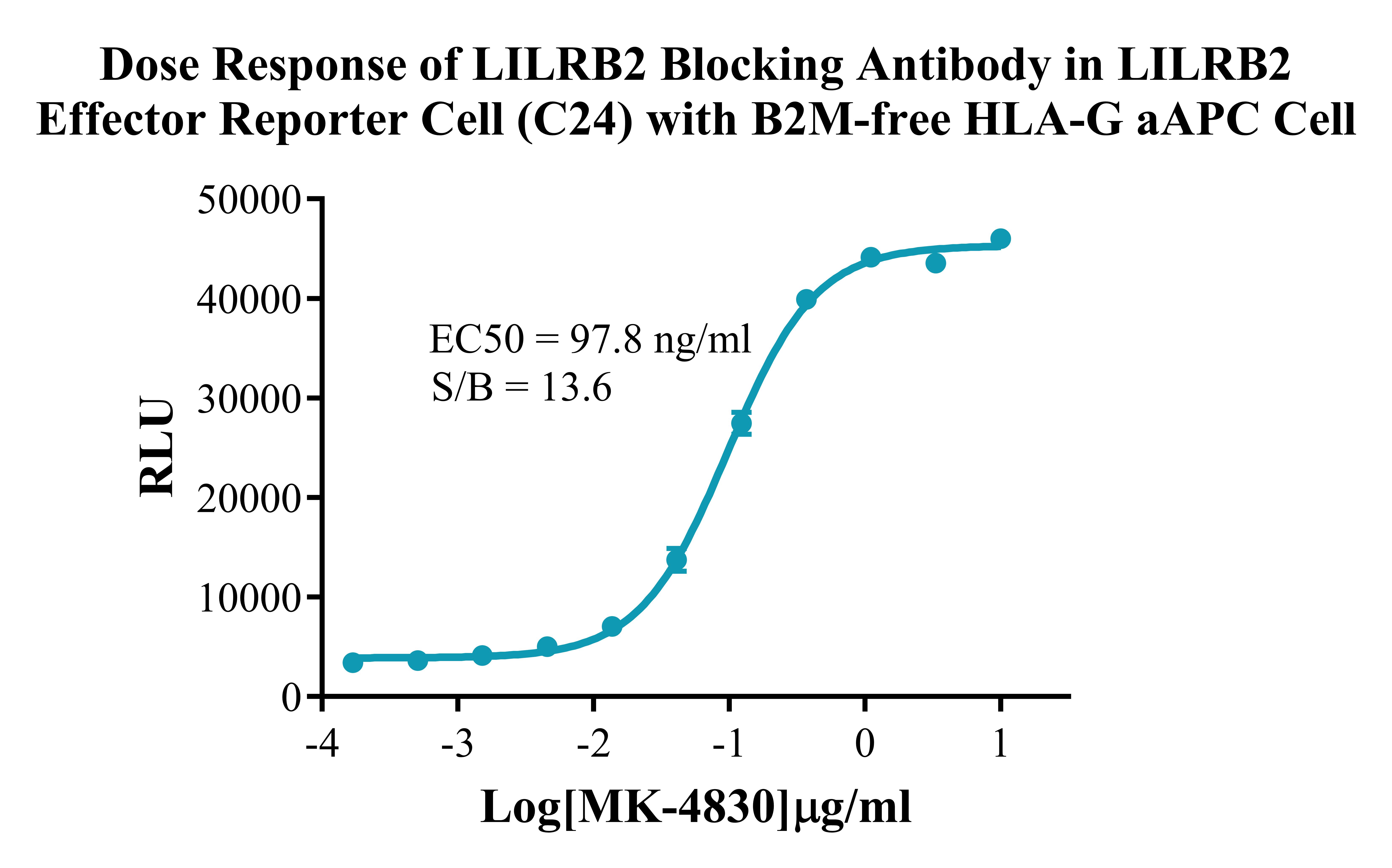 Figure 3.Dose Response of LILRB2 Blocking Antibody in LILRB2 Effector Reporter Cell (C24) With B2M-associated HLA-G/aAPC Cells(C15). |