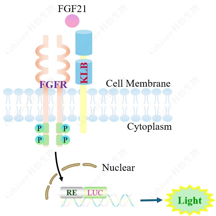 KLB Effector Reporter Cell 報告基因藥靶模型很好的模擬了體內 KLB 的信號轉導過(guò)程, 原理見(jiàn)下圖所示。 ![]() Figure 1. KLB Effector Reporter Cell 細胞模型原理圖
