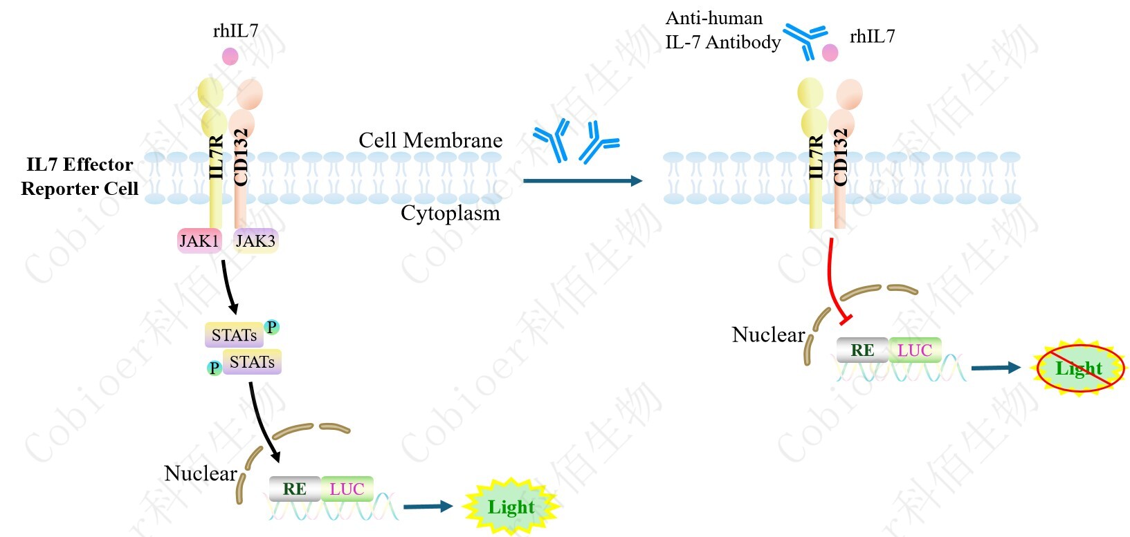 IL7 Effector Reporter Cell 報告基因藥靶模型很好的模擬了體內 IL7 的信號轉導過(guò)程,原理見(jiàn)下圖所示。![]() Figure 1. IL7 Effector Reporter Cell 模型原理圖 |