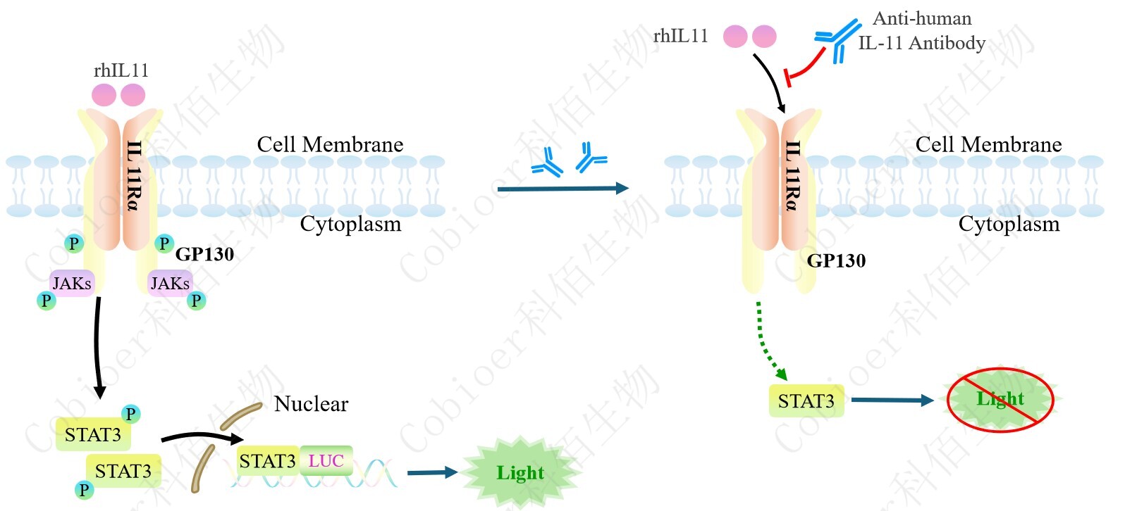 IL11 Effector Reporter Cell 報告基因藥靶模型很好的模擬了體內 IL11 的信號轉導過(guò)程, 原理見(jiàn)下圖所示。![]() Figure 1. IL11 Effector Reporter Cell 細胞模型原理圖 |