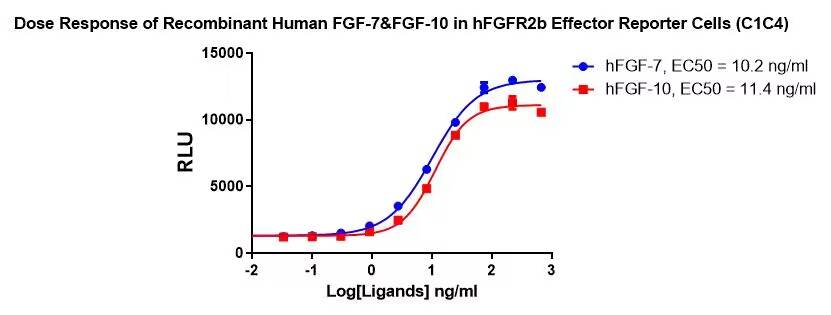 Figure 1. Dose Response of Recombinant Human FGF-7&FGF-10 in hFGFR2b Effector Reporter Cells (C1C4). |