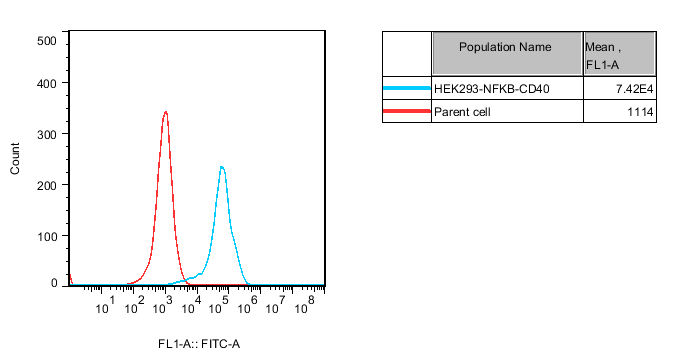 Figure 1. Recombinant HEK293 cell line expressing firefly luciferase gene under the control of NFκB response elements with constitutive expression of CD40. |