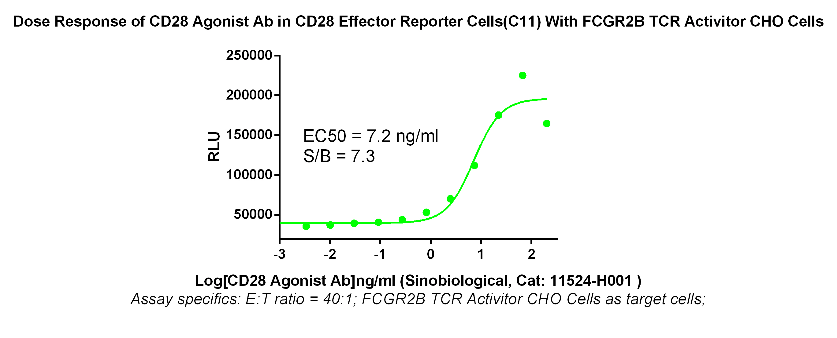 Figure 1 Dose Response of CD28 Agonist Ab in CD28 Effector Reporter Cells(C11) With FCGR2B TCR Activitor CHO Cells, the EC50 was 7.2ng/ml.