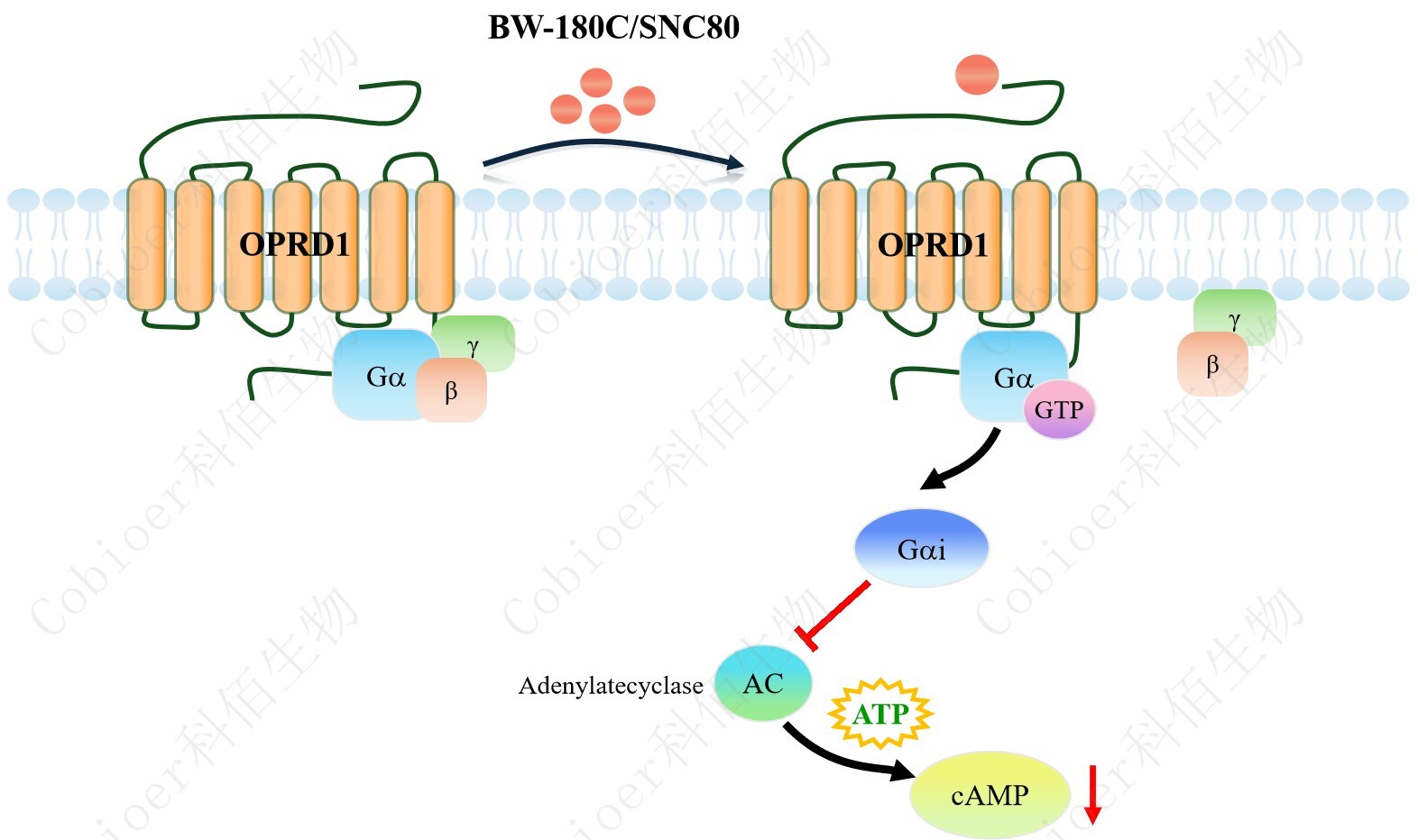 cAMP 在 G 蛋白偶聯(lián)受體(GPCR)信號轉導中是一種關(guān)鍵的第二信使。當配體結合到 GPCR,構象發(fā)生變化,激活受體接著(zhù)激活 G 蛋白,Gi 的激活導致腺苷酸環(huán)化酶調控 cAMP 的下調。OPRD1 CHO 藥靶模型很好的模擬了體內 OPRD1 的信號轉導過(guò)程,原理見(jiàn)下圖所示。 |