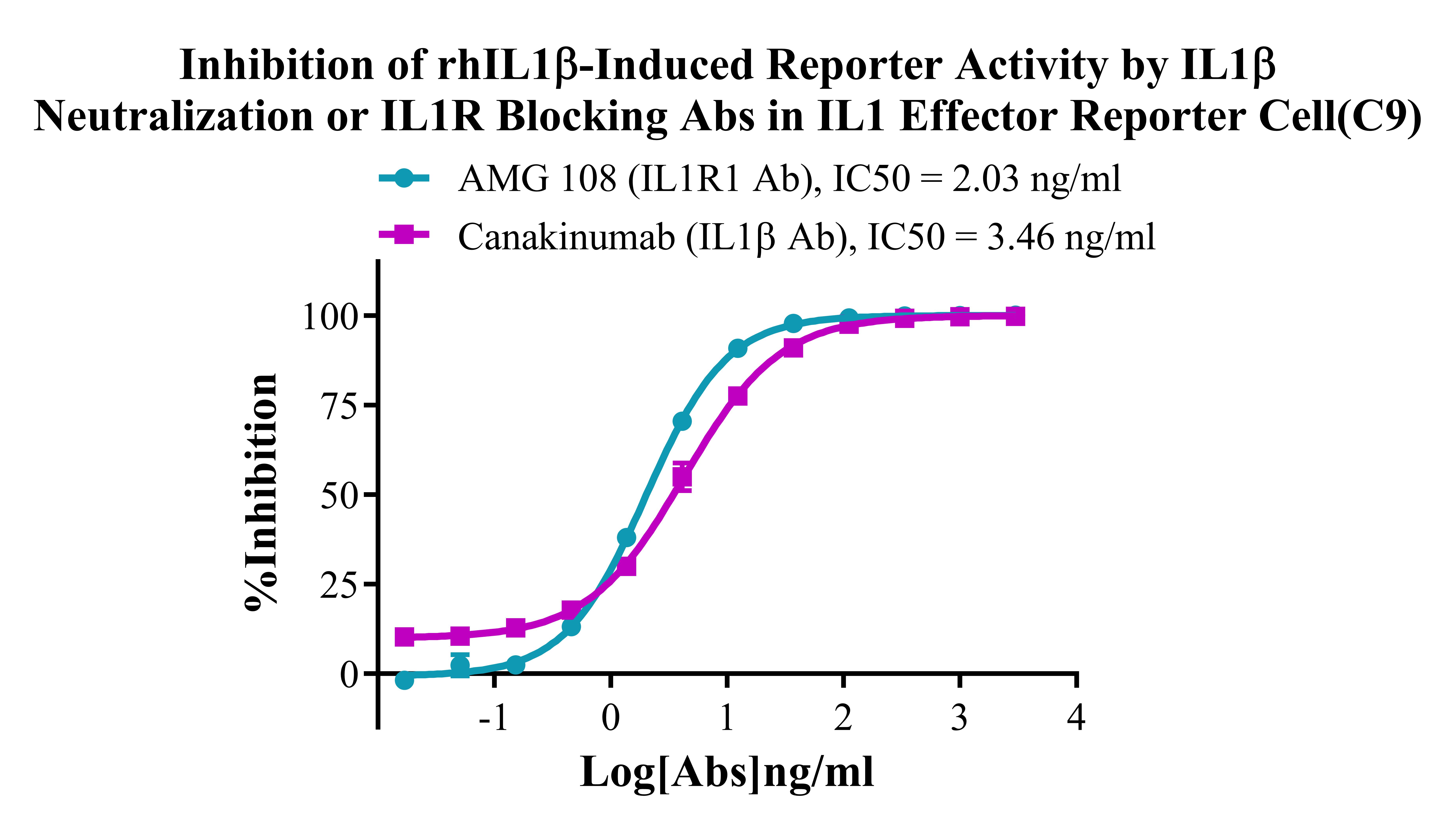 III. Representative Data![]() Figure 2. Dose Response of Recombinant Human IL1β in IL1 Effector Reporter Cell (C9). ![]() Figure 3. Inhibition of rhIL1β-Induced Reporter Activity by IL1β Neutralization or ILlR Blocking Abs in IL1 Effector Reporter Cell(C9). |