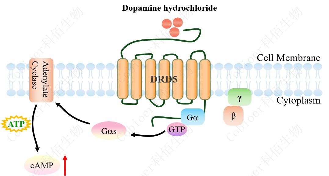 cAMP 在 G 蛋白偶聯(lián)受體(GPCR)信號轉導中是一種關(guān)鍵的第二信使。當配體結合 到 GPCR,構象發(fā)生變化,激活受體接著(zhù)激活 G 蛋白,Gs 的激活導致腺苷酸環(huán)化酶調控 cAMP 的升高。DRD5 CHO 藥靶模型很好的模擬了體內 DRD5 的信號轉導過(guò)程,原理見(jiàn)下圖所 示。