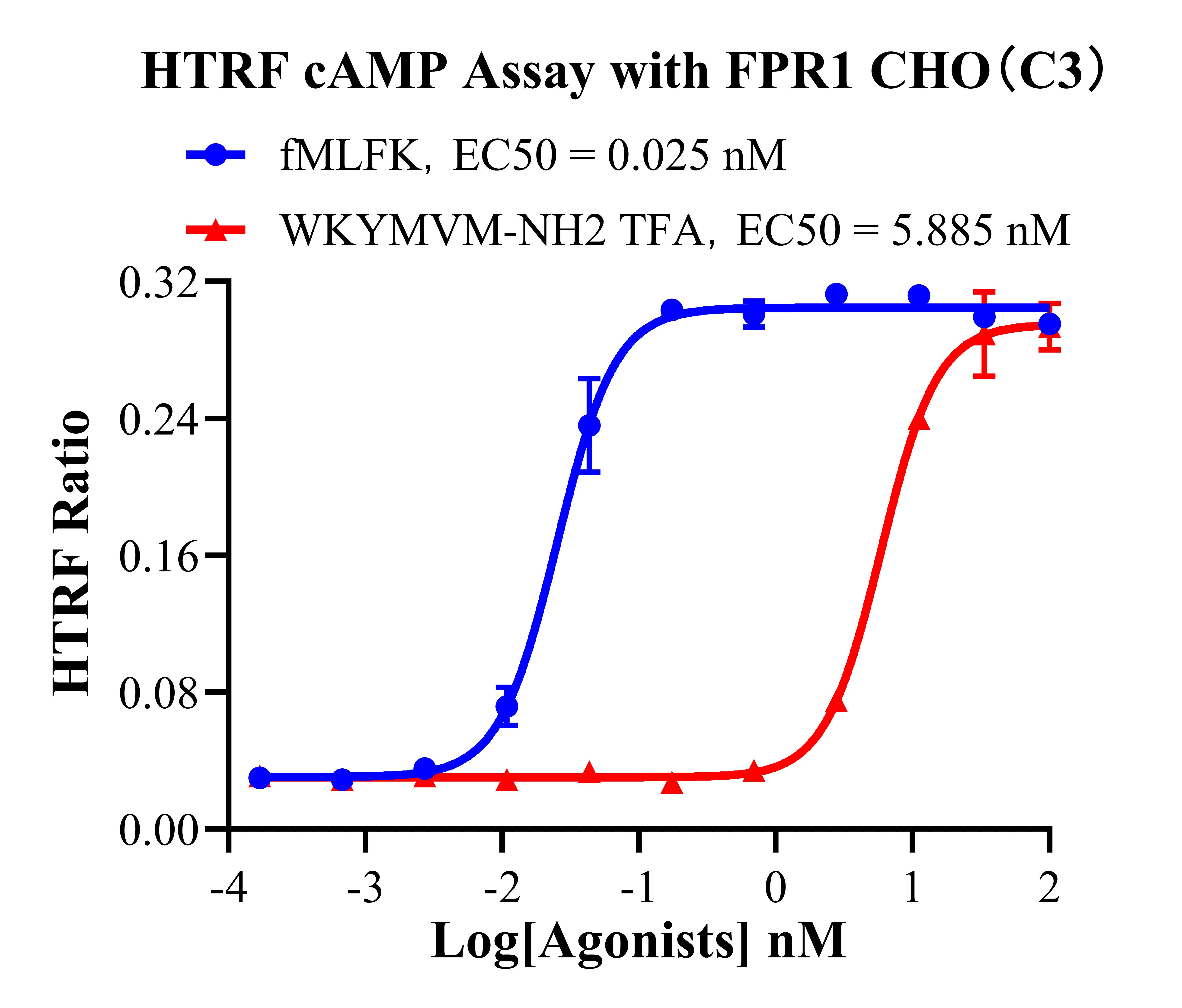 cAMP 在 G 蛋白偶聯(lián)受體(GPCR)信號轉導中是一種關(guān)鍵的第二信使。當配體結合 到 GPCR,構象發(fā)生變化,激活受體接著(zhù)激活 G 蛋白,Gi 的激活導致腺苷酸環(huán)化酶調控 cAMP 的下調。FPR1 CHO 藥靶模型很好的模擬了體內 FPR1 的信號轉導過(guò)程,原理見(jiàn)下圖 所示。