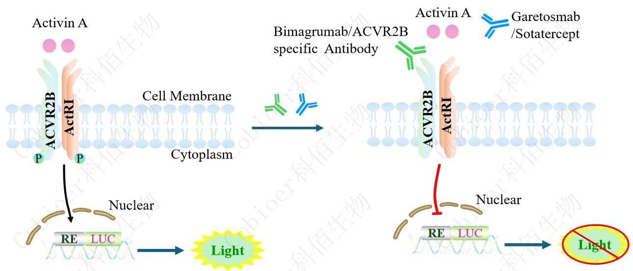 ACVR2B Effector Reporter Cell 報告基因藥靶模型很好的模擬了體內 ACVR2A 的信號轉導過(guò)程,原理見(jiàn)圖 所示。