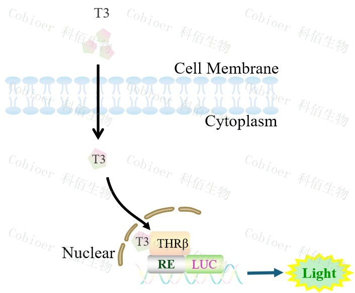 THRB Luciferase Reporter HEK293,是由 THRB 調控并表達 Luc 熒光素 酶報告基因的 HEK293 細胞。甲狀腺激素(T3/T4)是一種有效的甲狀腺激素,主要通過(guò)結 合 TRs 發(fā)揮作用,調控基因表達和細胞功能,原理見(jiàn)下圖所示。![]() Figure 1. THRB Luciferase Reporter HEK293 原理示意圖