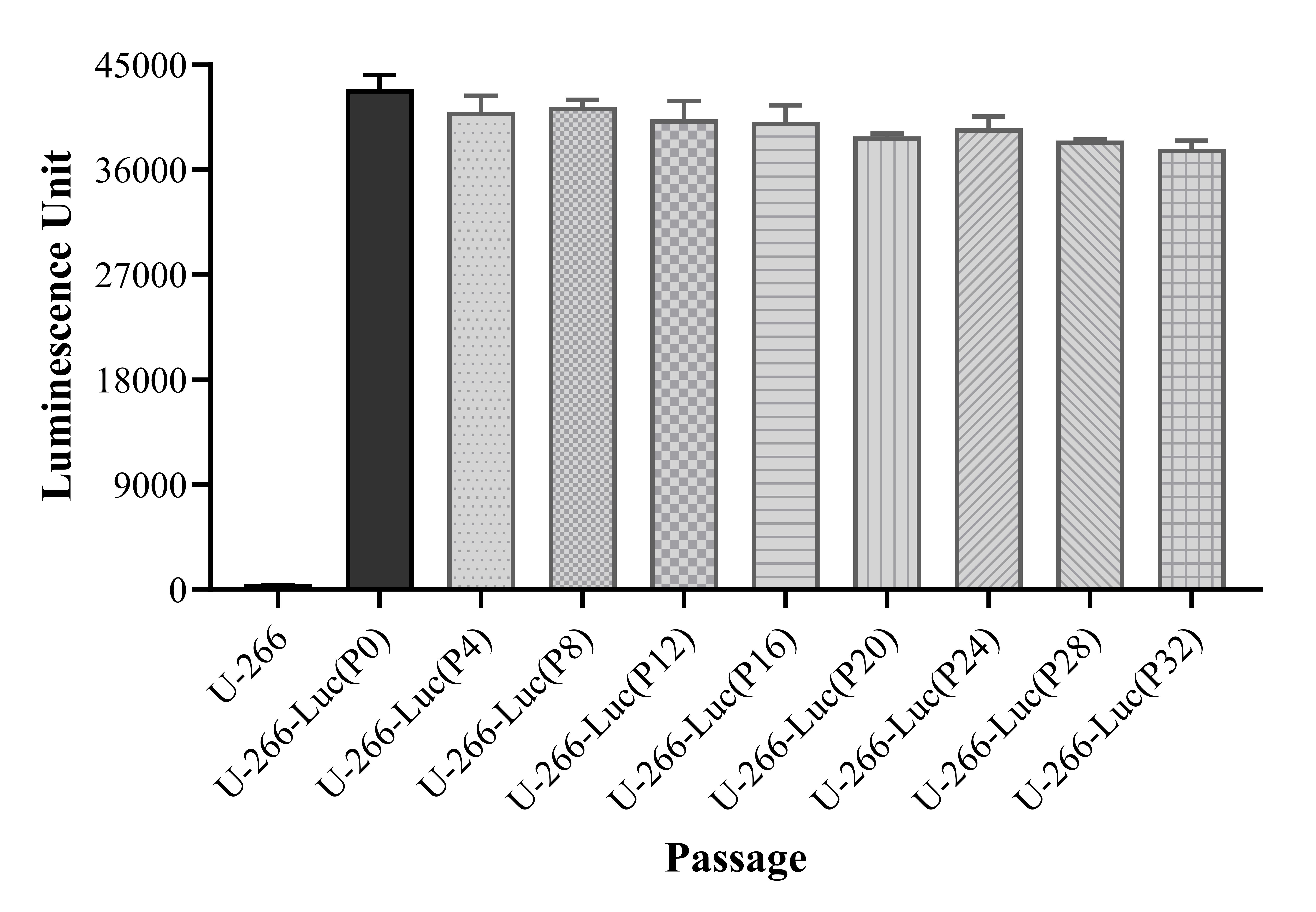 Figure 1. Stablity test results. U-266-Luc showed at least 32 passage stability with similar luminescence unit. |