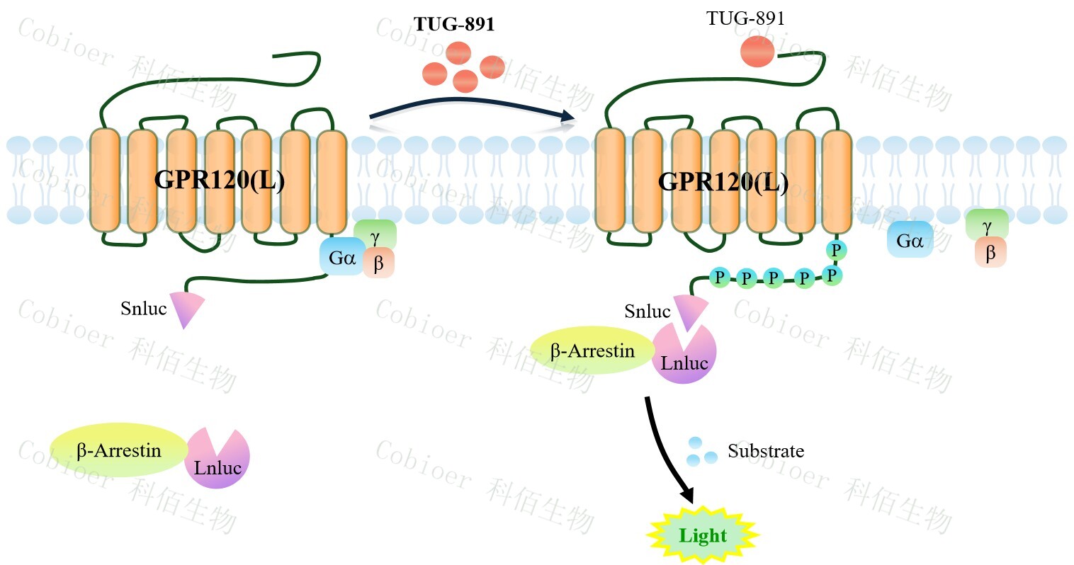 GPR120(L) β-Arrestin CHO 報告基因藥靶模型很好的模擬了體內 GPR120(L)/β-Arrestin 的信號轉導過(guò)程,原理見(jiàn)圖 1 所示。當缺乏配體刺激時(shí),β-Arrestin 不與 GPR120(L)結合, 融合β-Arrestin 的熒光素酶處于失活構象,當 GPR120(L)遭遇配體刺激時(shí),融合熒光素酶報 告基因的β-Arrestin 被招募,使熒光素酶報告基因處于激活狀態(tài),加入其底物后發(fā)光信號增 強。![]() Figure 1. GPR120(L) β-Arrestin CHO 細胞模型原理圖 |