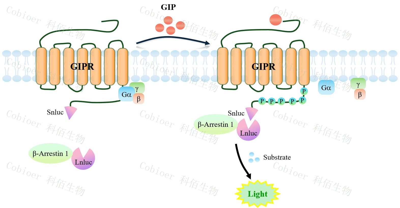 GIPR β-Arrestin 1 CHO 報告基因藥靶模型很好的模擬了體內 GIPR/β-Arrestin 1 的信號 轉導過(guò)程,原理見(jiàn)下圖所示。當缺乏配體刺激時(shí),β-Arrestin 1 不與 GIPR 結合,融合β- Arrestin 1 的熒光素酶處于失活構象,當 GIPR 遭遇配體刺激時(shí),融合熒光素酶報告基因的 β-Arrestin 1 被招募,使熒光素酶報告基因處于激活狀態(tài),加入其底物后發(fā)光信號增強。![]() Figure 1. GIPR β-Arrestin 1 CHO 細胞模型原理圖 |
