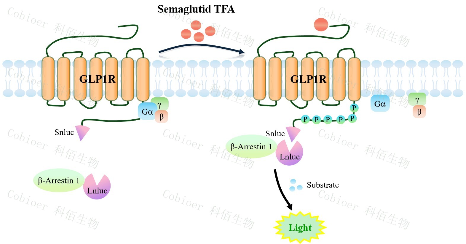 GLP1R β-Arrestin 1 CHO 報告基因藥靶模型很好的模擬了體內 GLP1R/β-Arrestin 1 的信 號轉導過(guò)程,原理見(jiàn)下圖所示。當缺乏配體刺激時(shí),β-Arrestin 1 不與 GLP1R 結合,融合β- Arrestin 1 的熒光素酶處于失活構象,當 GLP1R 遭遇配體刺激時(shí),融合熒光素酶報告基因 的β-Arrestin 1 被招募,使熒光素酶報告基因處于激活狀態(tài),加入其底物后發(fā)光信號增強。![]() Figure 1. GLP1R β-Arrestin 1 CHO 細胞模型原理圖 |
