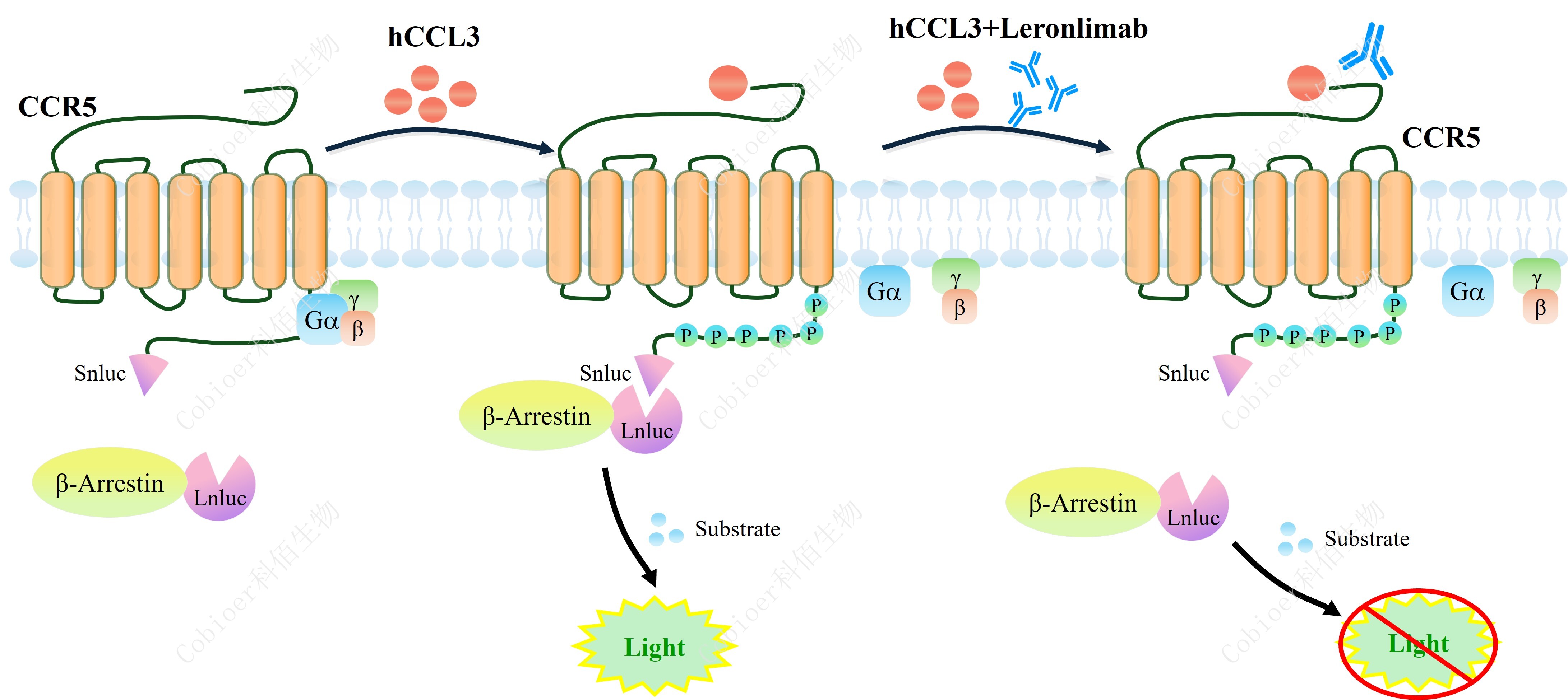 報告基因細胞模型可以很好的反映分子作用機制,同時(shí)具備更小的變異性和更好的可 操作性,已被中檢院及藥企廣泛應用于抗體藥物生物活性的檢定,對于藥物研發(fā)、質(zhì)量控 制、批次放行都有重要意義。 CCR5 β-Arrestin CHO 報告基因藥靶模型很好的模擬了體內 CCR5/β-Arrestin 的信號轉導過(guò)程,原理見(jiàn)下圖所示。![]() Figure 1. CCR5 β-Arrestin CHO 細胞模型原理圖