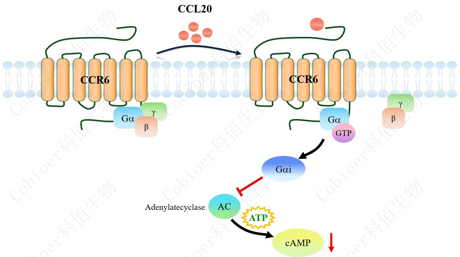 cAMP 在 G 蛋白偶聯(lián)受體(GPCR)信號轉導中是一種關(guān)鍵的第二信使。當配體結合到 GPCR,構象發(fā)生變化,激活受體接著(zhù)激活 G 蛋白,Gi 的激活導致腺苷酸環(huán)化酶調控 cAMP 的下調。CCR6 藥靶模型很好的模擬了體內 CCR6 的信號轉導過(guò)程,原理見(jiàn)下圖所示。![]() Figure 1. CCR6 CHO 細胞模型原理圖 |