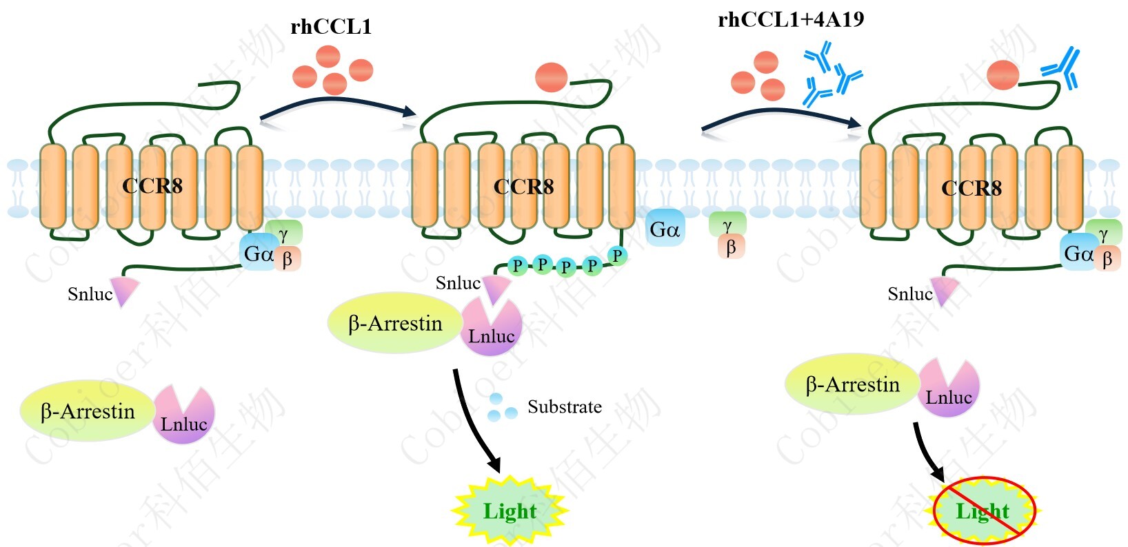 CCR8 β-Arrestin CHO 報告基因藥靶模型很好的模擬了體內 CCR8/β-Arrestin 的信號轉導過(guò)程,原理見(jiàn)下圖所示。當缺乏配體刺激時(shí),β-Arrestin 不與 CCR8 結合,融合β-Arrestin的熒光素酶處于失活構象,當 CCR8 遭遇配體刺激時(shí),融合熒光素酶報告基因的β-Arrestin被招募,使熒光素酶報告基因處于激活狀態(tài),加入其底物后發(fā)光信號增強。