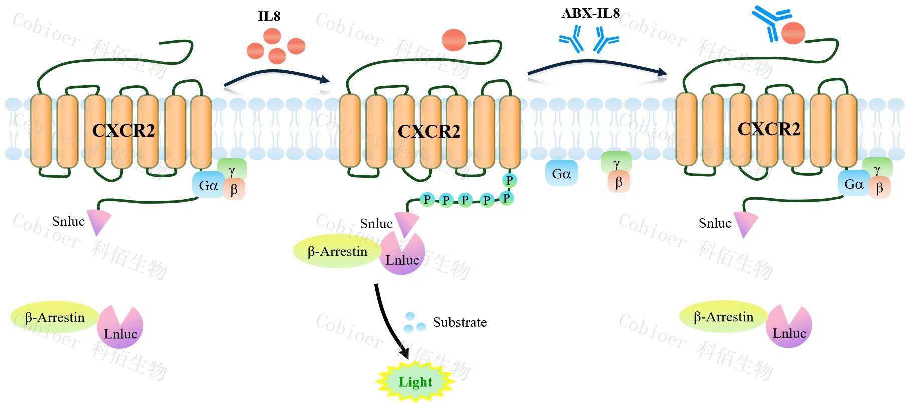 CXCR2 β-Arrestin CHO 報告基因藥靶模型很好的模擬了體內 CXCR2/β-Arrestin 的信號 轉導過(guò)程,原理見(jiàn)下圖所示。當缺乏配體刺激時(shí),β-Arrestin 不與 CXCR2 結合,融合β- Arrestin 的熒光素酶處于失活構象,當 CXCR2 遭遇配體刺激時(shí),融合熒光素酶報告基因的 β-Arrestin 被招募,使熒光素酶報告基因處于激活狀態(tài),加入其底物后發(fā)光信號增強。![]() Figure 1. CXCR2 β-Arrestin CHO 細胞模型原理圖 |