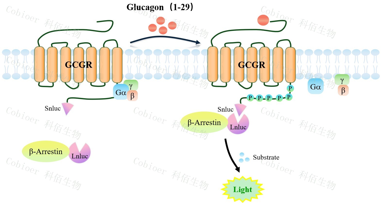 GCGR β-Arrestin CHO 報告基因藥靶模型很好的模擬了體內 GCGR/β-Arrestin 的信號轉 導過(guò)程,原理見(jiàn)下圖所示。當缺乏配體刺激時(shí),β-Arrestin 不與 GCGR 結合,融合β- Arrestin 的熒光素酶處于失活構象;當 GCGR 遭遇配體刺激時(shí),融合熒光素酶報告基因的β- Arrestin 被招募,使熒光素酶報告基因處于激活狀態(tài),加入其底物后發(fā)光信號增強。![]() Figure 1. GCGR β-Arrestin CHO 細胞模型原理圖 |