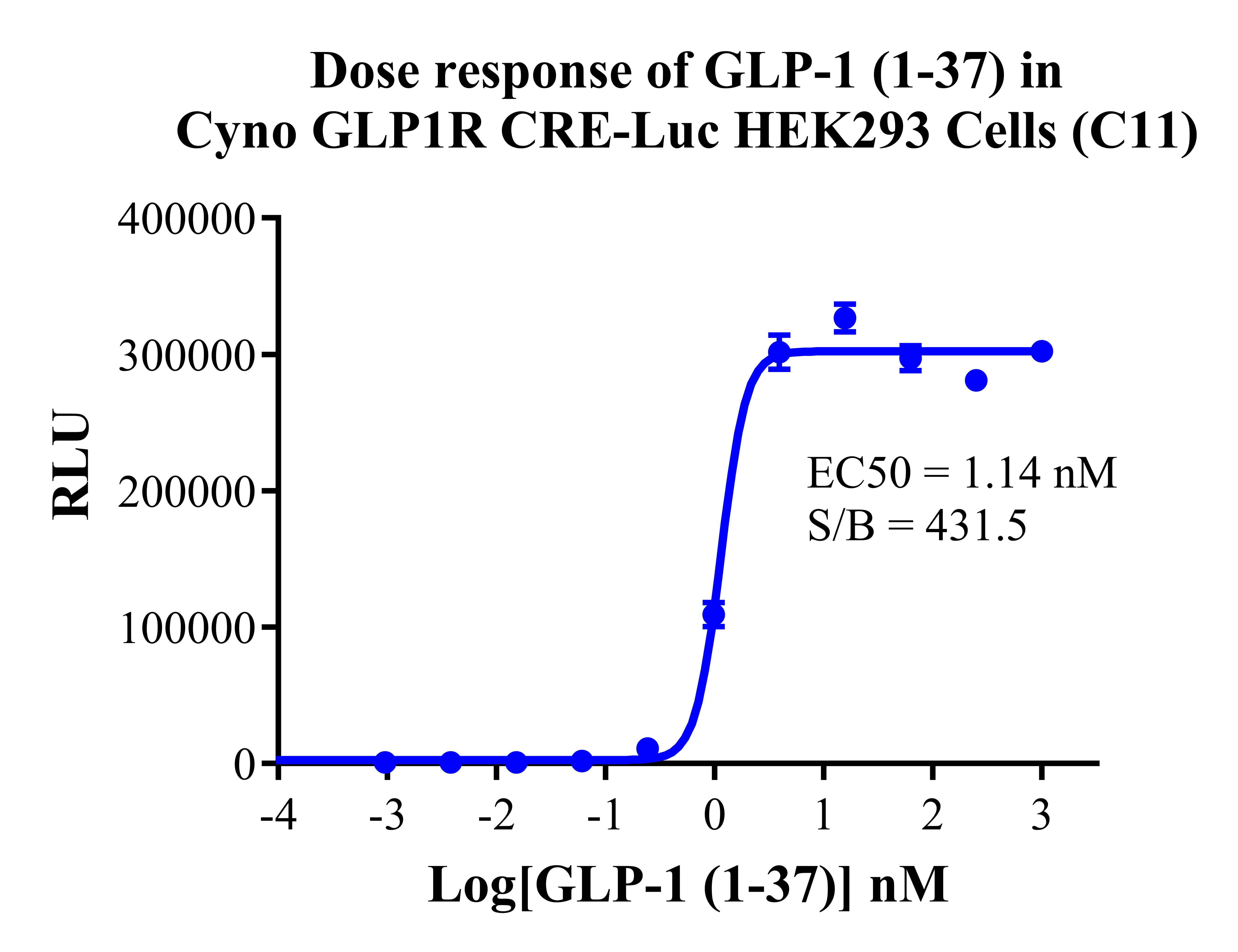 Figure 3. Dose response of GLP-1 (1-37) in Cyno GLP1R CRE-Luc HEK293 Cells (C11). |
