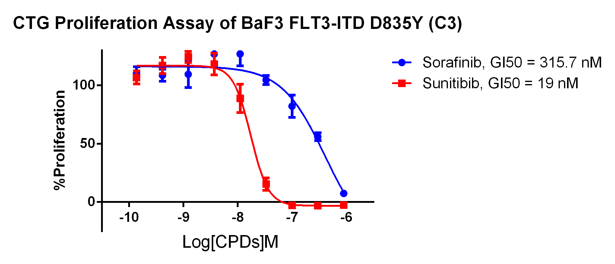 Figure . Anti-proliferation assay of two reference compounds on the FLT3-ITD [D835Y]/BaF3 Stable Cell Line. |