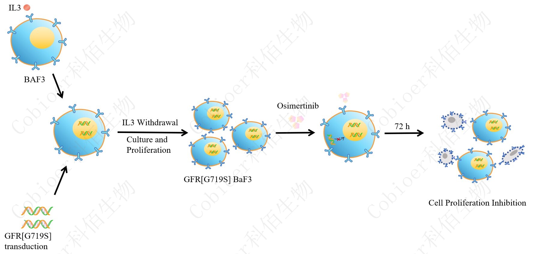 BaF3(小鼠原 B 細胞)的生長(cháng)和增殖需要 IL-3 的維持。通過(guò)引入各種表達激酶的基因, 能作為 BaF3 的驅動(dòng)基因,讓 BaF3 不再依賴(lài) IL-3 而增殖,進(jìn)而激酶基因成為 BaF3 增殖依 賴(lài)的驅動(dòng)基因,用于評估小分子藥物對激酶的靶向抑制作用,原理及流程見(jiàn)下圖所示。