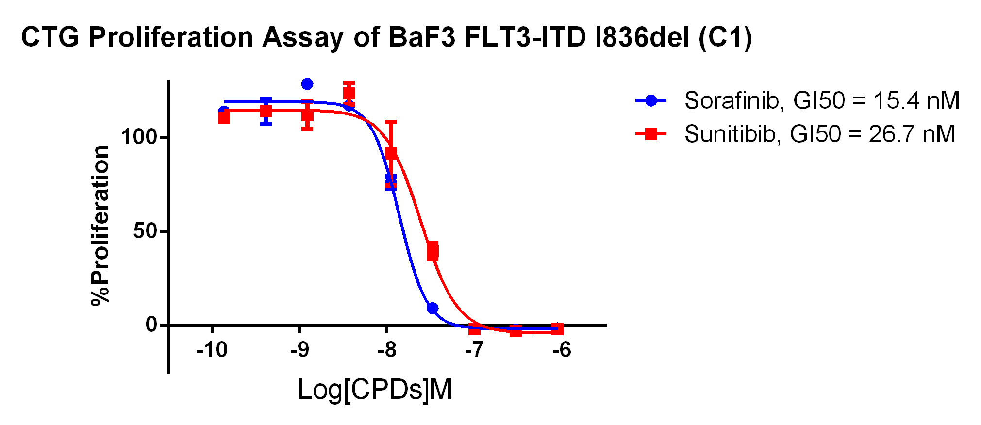 Figure . Anti-proliferation assay of two reference compounds on the FLT3-ITD [I836del]/BaF3 Stable Cell Line. |