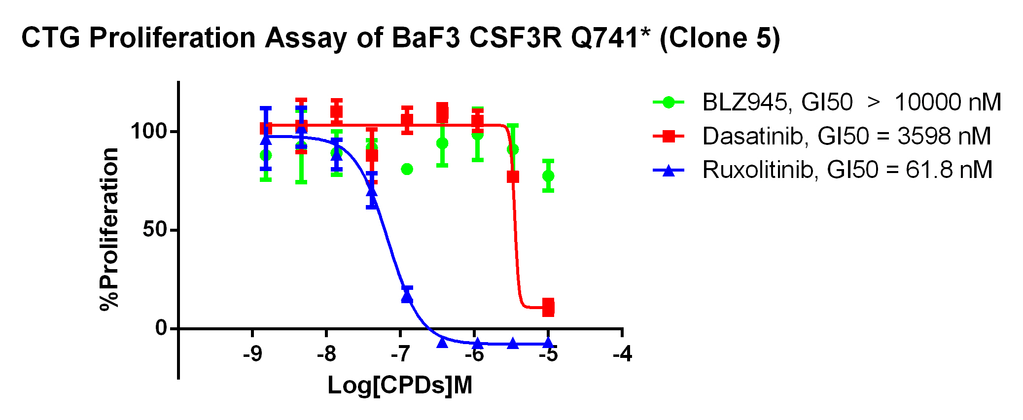 Figure 2. Anti-proliferation assay of three reference compounds on the CSF3R Q741/BaF3. |