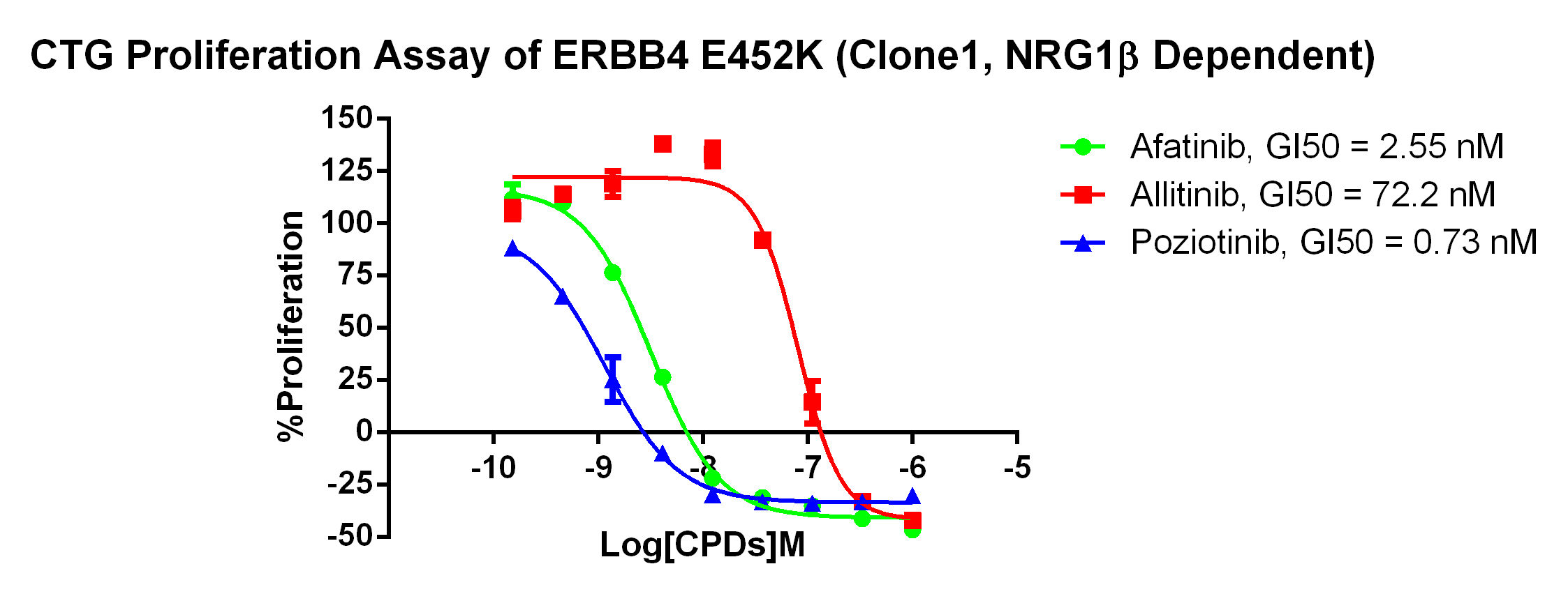 Figure 2. Anti-proliferation assay of two reference compounds on the ERBB4 E452K (NRG1b Dependent)/BaF3 Stable Cell line. |