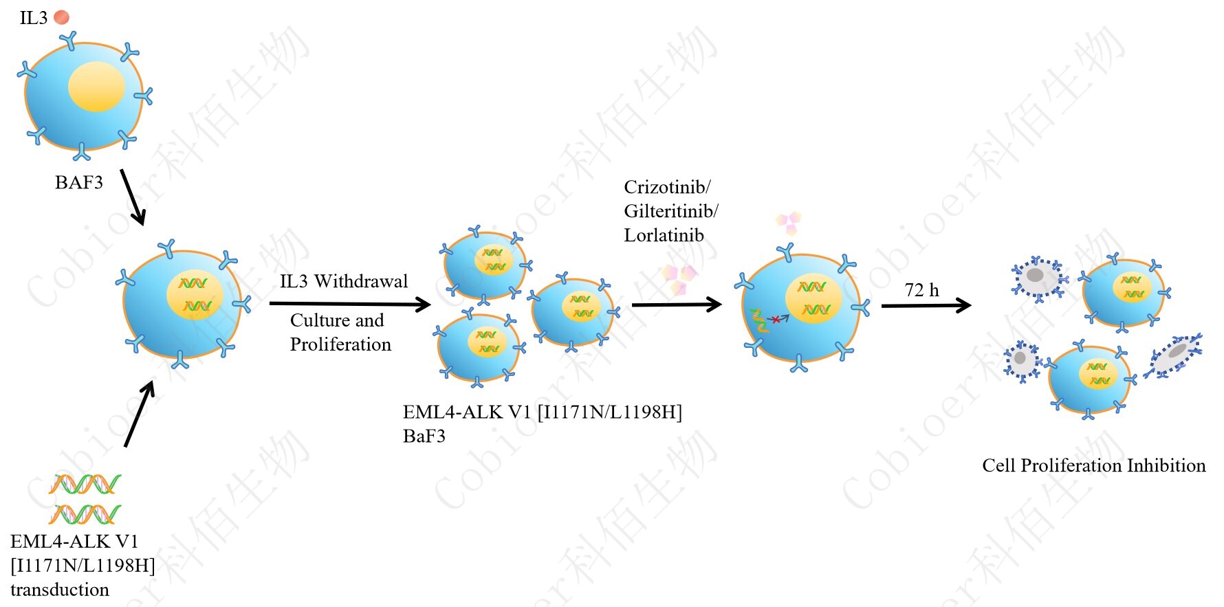 BaF3(小鼠原 B 細胞)的生長(cháng)和增殖需要 IL-3 的維持。通過(guò)引入各種表達激酶的基因, 能作為 BaF3 的驅動(dòng)基因,讓 BaF3 不再依賴(lài) IL-3 而增殖,進(jìn)而激酶基因成為 BaF3 增殖依 賴(lài)的驅動(dòng)基因,用于評估小分子藥物對激酶的靶向抑制作用,原理及流程見(jiàn)下圖所示。