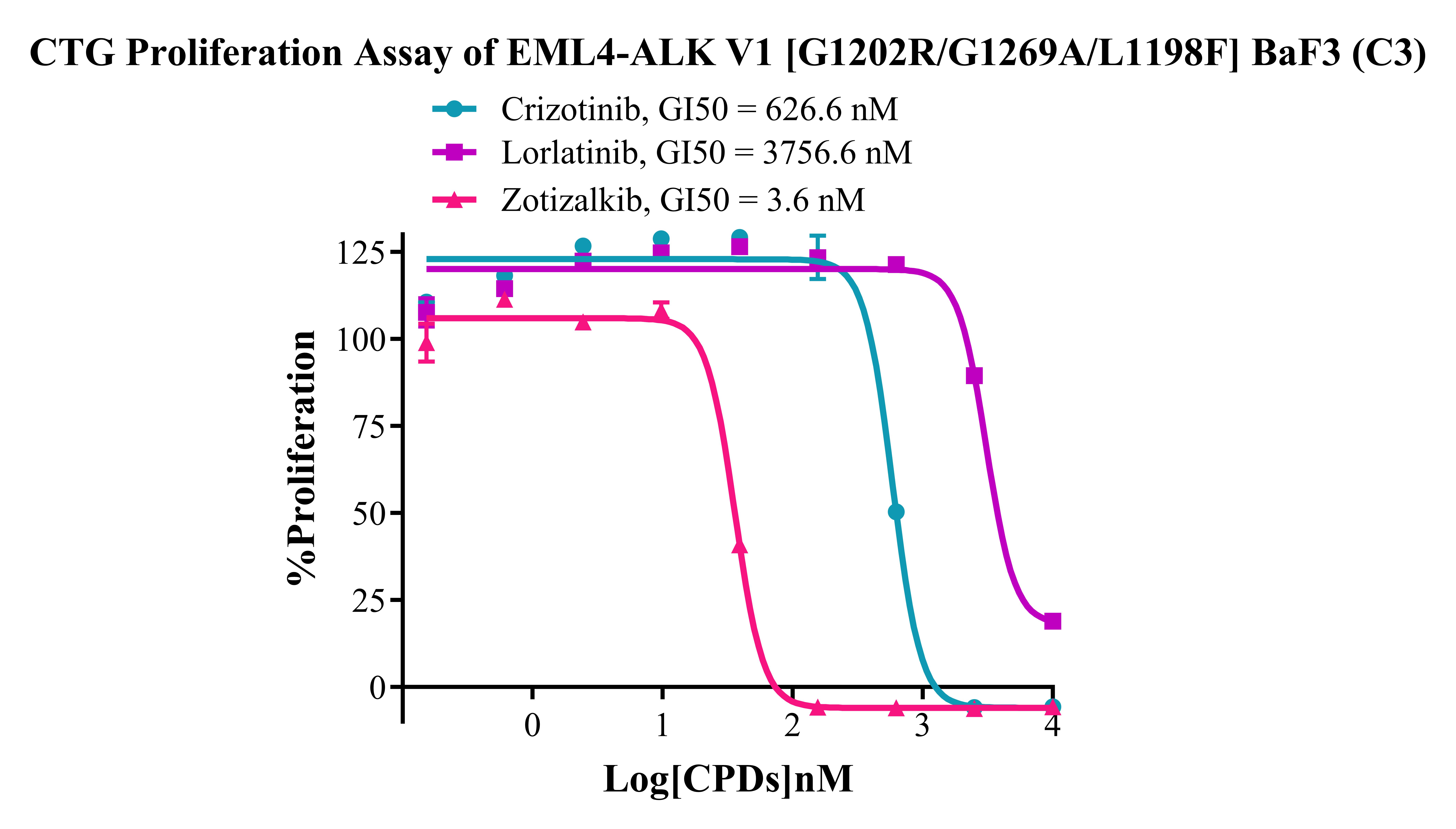 Figure 5. CTG Proliferation Assay of EML4-ALK V1 [G1202R/G1269A/L1198F] BaF3(C3). |
