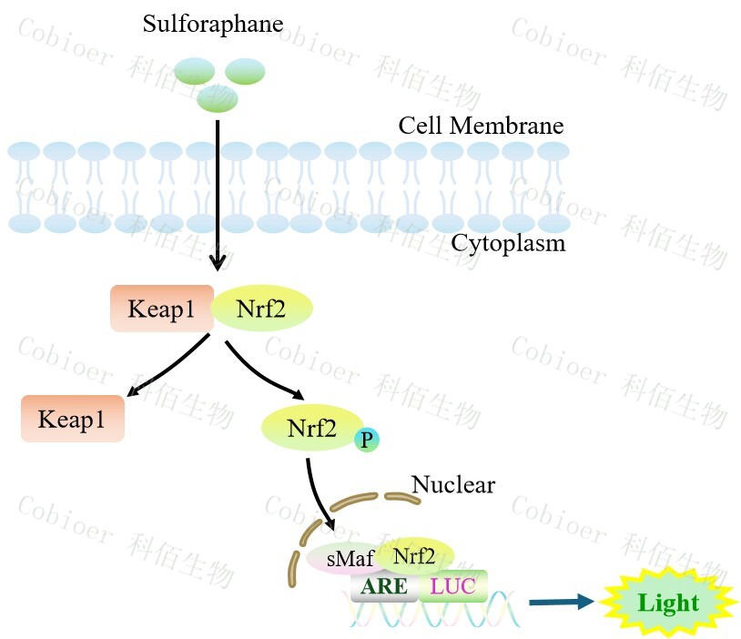 ARE-Luc(Nrf2 Antioxidant Pathway) HEK293 報告基因細胞,是由 ARE 調控并表達 Luc 熒光素酶報告基因的 HEK293 細胞。Sulforaphane 是 Keap1/Nrf2/ARE 的誘 導劑,原理見(jiàn)下圖所示。![]() Figure 1. ARE-Luc(Nrf2 Antioxidant Pathway) HEK293 細胞模型原理圖