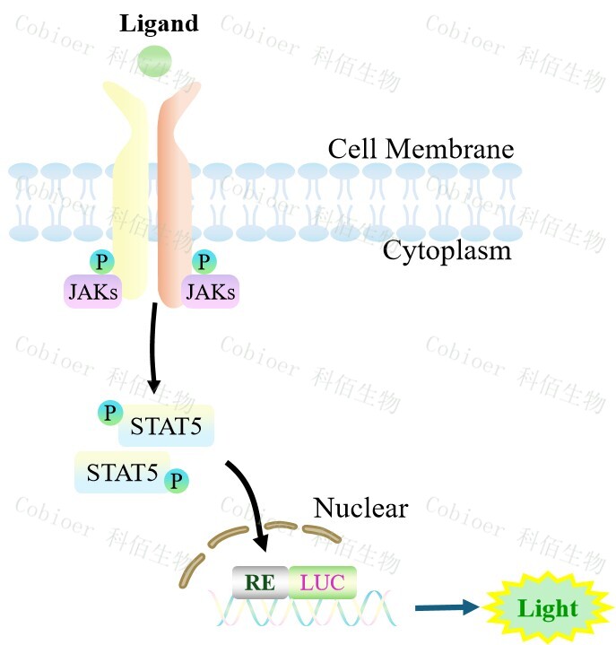 STAT5-Luc TF1 報告基因細胞,是由 STAT5 調控并表達 Luc 熒光素酶報 告基因的 TF1 細胞。GM-CSF 與受體結合,激活 STAT5 的原理見(jiàn)下圖所示。![]() Figure 1. STAT5-Luc TF1 細胞模型原理圖 |