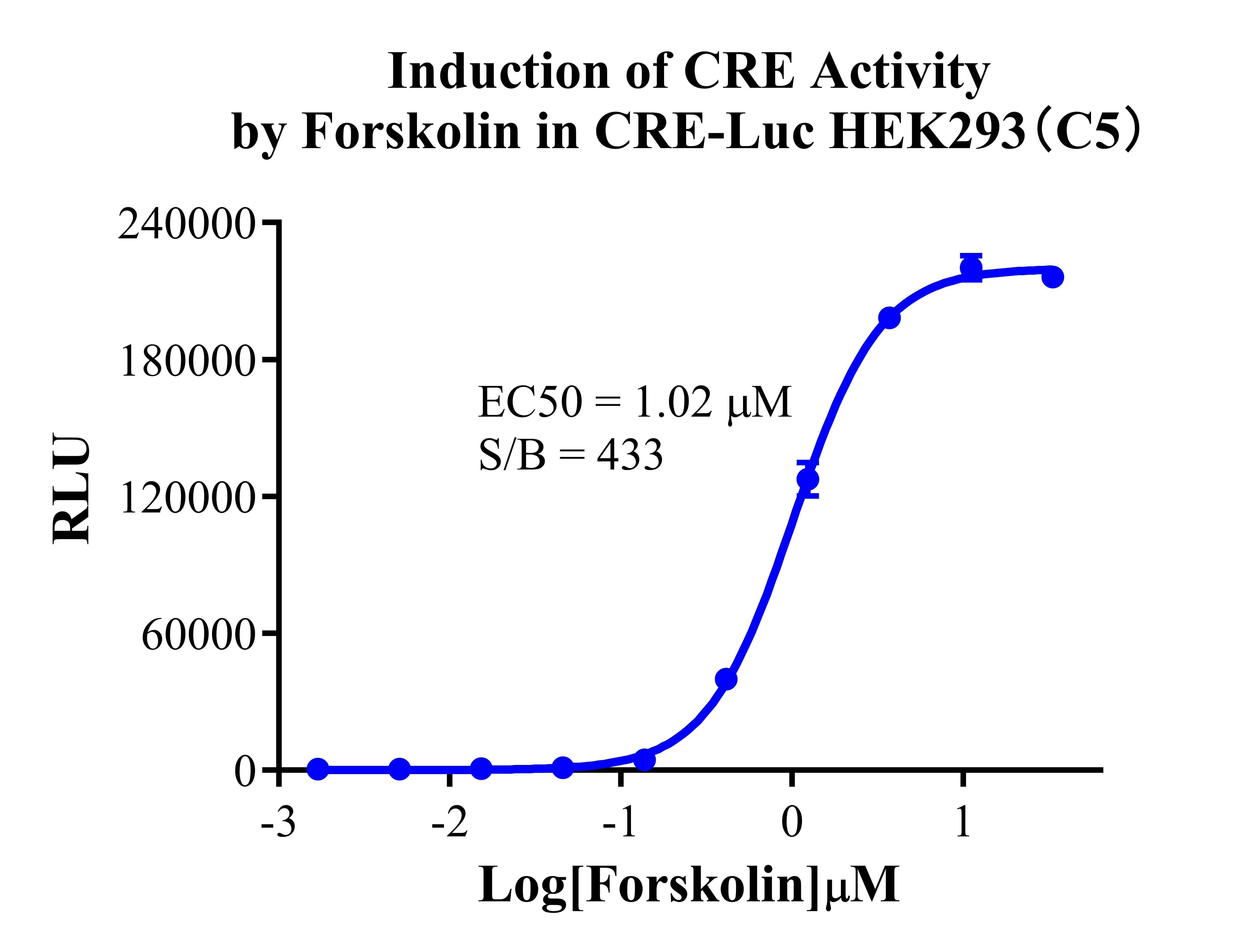 CRE-Luc HEK293 報告基因細胞是由 CRE 調控并表達 Luc 熒光素酶報告基因的 HEK293 細胞。Forskolin 是天然存在的直接腺苷酸環(huán)化酶(AC)/cAMP/CREB 的 激活劑,原理見(jiàn)下圖所示。![]() Figure 1:CRE-Luc HEK293 原理示意圖 |