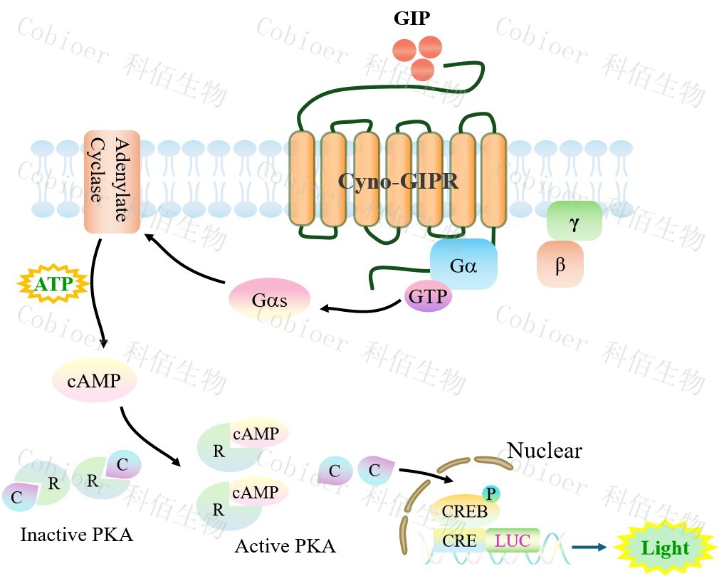 Cyno GIPR CRE-Luc HEK293 報告基因藥靶模型很好的模擬了體內 GIPR 的信號轉導過(guò)程,原理見(jiàn)下圖所示。