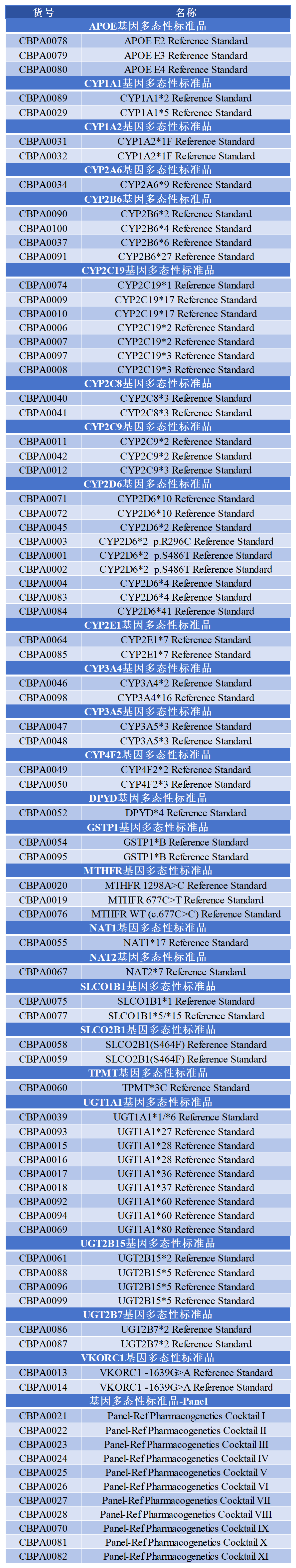 科佰生物目前可提供近百種用藥指導的質(zhì)控單品及混合質(zhì)控盤(pán),涵蓋APOE、CYP1A1、CYP2A6、CYP2B6、CYP2C19、CYP2C8、CYP2C9、CYCP2D6、CYP2E1、CYP3A4、CYP3A5、CYP4F2、DPYD、GSTP1、MTHFR、NAT1、NAT2、SLCO1B1、TPMT、UGT1A1、UGT2B15、UGT2B7、VKORC1等多個(gè)藥物代謝基因,可在全流程對檢測過(guò)程進(jìn)行監控,幫助實(shí)現個(gè)體化用藥基因檢測的精準性。