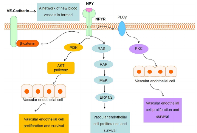 以血管內皮細胞為例,NPY與其受體結合后,通過(guò)PI3K/AKT通路、RAS/RAF/MEK/ERK1/2通路、PKC通路促進(jìn)內皮細胞增殖,為血管提供營(yíng)養,調節微環(huán)境。