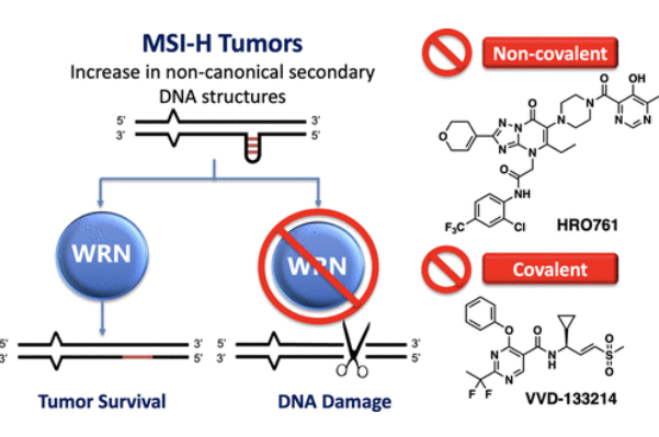 國際頂級(jí)期刊之一Nature于去年同一天上線了兩篇關(guān)于WRN(Werner綜合征RecQ解旋酶)抑制劑的文章,其中一篇是關(guān)于Novartis的HRO761的發(fā)現(xiàn)過程,另一篇介紹了拜耳(Bayer)旗下Vividion Therapeutics 公司的VVD-133214 (又叫RO7589831)的發(fā)現(xiàn)過程。這些文章重燃了醫(yī)藥行業(yè)對(duì)“WRN”這個(gè)合成致死靶點(diǎn)的關(guān)注。