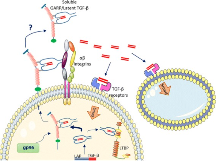 LTGF-β 是前體 TGF-β(pro-TGF-β)與潛伏相關(guān)肽(LAP)形成的復(fù)合物,TGF-β以無(wú)活性的同源二聚體前體蛋白形式合成,經(jīng)由類似于弗林蛋白酶的蛋白酶切割后形成LTGF-β 。GARP 能增強(qiáng)弗林蛋白酶依賴性切割,并與LTGF-β 結(jié)合。內(nèi)質(zhì)網(wǎng)腔內(nèi)的主要伴侶蛋白 gp96 確保 GARP 的正確折疊及其在細(xì)胞表面的表達(dá)。在細(xì)胞表面,GARP/LTGF-β復(fù)合物與α-β整合素(αVβ6 和αVβ8)結(jié)合,釋放成熟的 TGF-β 肽。成熟的 TGF-β 以自分泌和旁分泌的方式與細(xì)胞表面的 TGF-β 受體相互作用。在某些情況下,GARP/LTGF-β復(fù)合物也可以從細(xì)胞表面釋放,但如何從可溶性復(fù)合物中激活 TGF-β 尚不清楚。