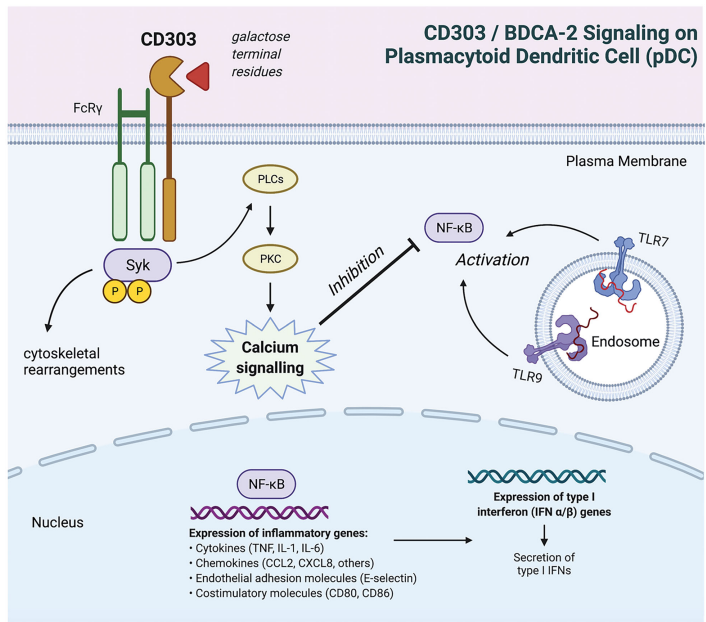 BDCA-2 (blood DC antigen 2血液樹(shù)突狀細胞抗原2)又叫CLEC4C或CD303,是人類(lèi)pDCs特有的II型c型凝集素受體(CLR),與TLR-7/9協(xié)同識別微生物和協(xié)調炎癥免疫反應。BDCA-2是一種可溶性跨膜糖蛋白,由聚集在12號染色體上的c型凝集素編碼基因編碼,包括KLRG1和CLEC4A。與其他CLR類(lèi)似,BDCA-2具有單個(gè)胞外碳水化合物識別結構域,并且在其短細胞質(zhì)尾部缺乏固有的信號基序。BDCA-2選擇性地與IgG分子上的半乳糖端聚糖結合,產(chǎn)生抗炎反應來(lái)抵抗因為通過(guò)抗原吸收、內化、呈遞給T細胞以及信號通路如IFN-I,NF-kB等其他炎性體激活。BDCA-2與跨膜區的FcRγ鏈形成adaptor,允許酪氨酸激酶募集磷酸化以及鈣動(dòng)員,類(lèi)似于b細胞受體(BCR)信號體,BDCA-2信號通過(guò)免疫受體酪氨酸激活發(fā)生基序(ITAM)介導的酪氨酸(Syk)磷酸化,磷脂酰肌醇特異性磷酯酶(PLCγ2),PKC的激活等誘導鈣流入并在pDC中充當負調節劑,介導IFN-Ⅰ抑制并通過(guò)BDCA2觸發(fā)減少NFKB的激活。