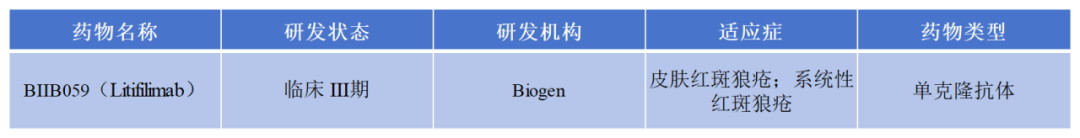 目前,全球關(guān)于BDCA-2這個(gè)靶點(diǎn)的在研管線(xiàn)并沒(méi)有很多,進(jìn)展最快的是渤健生物開(kāi)發(fā)的BDCA-2單抗BIIB059(Litifilimab),通過(guò)抑制BDCA-2,減少I(mǎi)FN-I等炎性細胞因子的產(chǎn)生,從而達到治療紅斑狼瘡的目的。